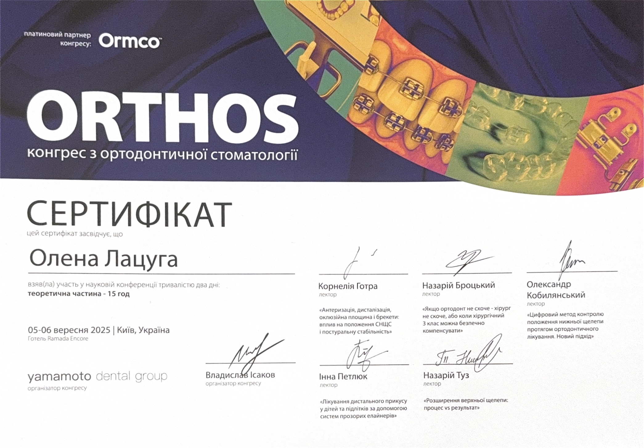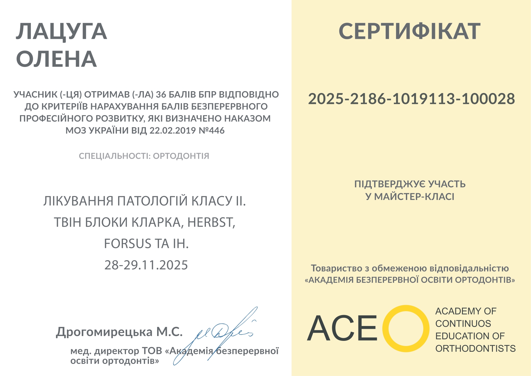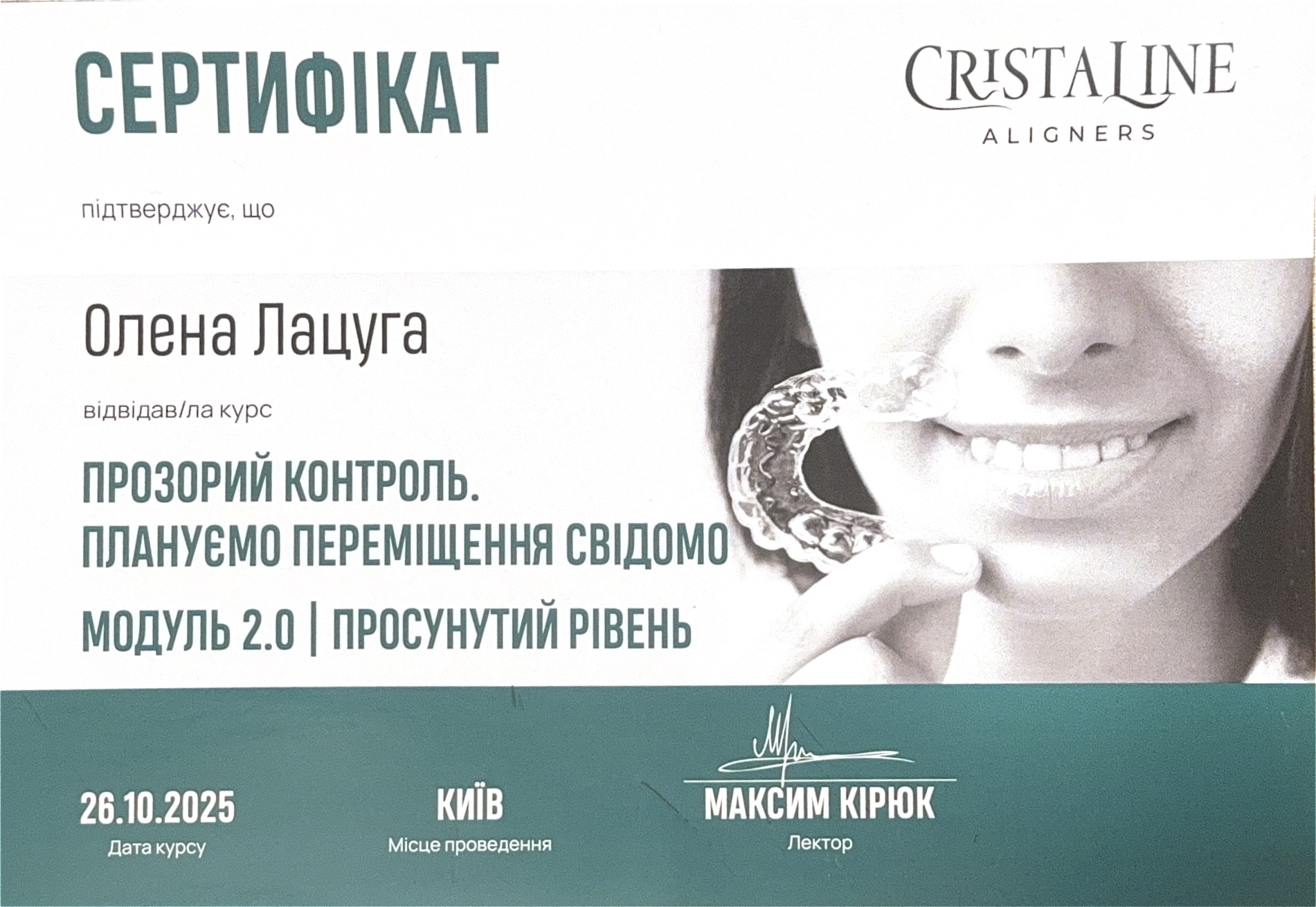 закінчила цикл спеціалізації «Ортодонтія» в НУОЗУ ім. П. Л. Шупика