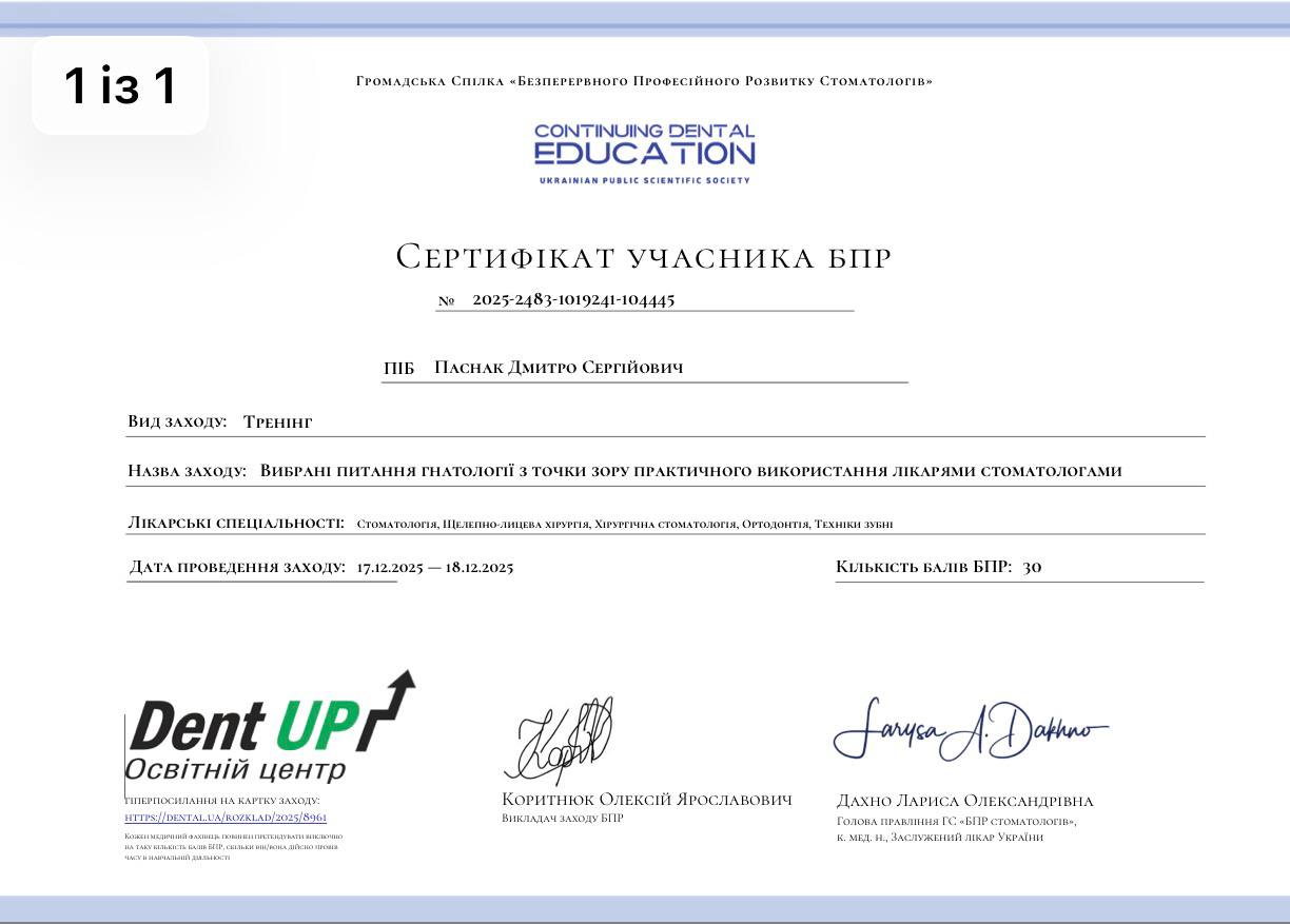 Вітаю, мене звати Паснак Дмитро Сергійович, я лікар стоматолог-ортопед в клініці UKrDentClub. На даній посаді я займаюсь улюбленою справою: роблю людей трішки щасливішими, а їх посмішку щирою та здоровою. Відвідуючи різні заходи по навчанню лікарів, я завжди йду в ногу з часом по впровадженню нових, сучасних, безболісних методів лікування та протезування зубів, таких як керамічні вініри, накладки, діоксид цирконієві коронки, коронки на імплантатах. Тож якщо у Вас відсутні зуби, відсутнє нормальне пережовування їжі, чи Ви хочете покращити естетику своїх зубів будемо раді бачити в нашій клініці.