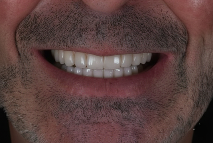 Чоловік прийшов на прийом задоволений отриманим результатом, виглядав впевнено та з нетерпінням чекав завершення лікування для фінального ефекту. Ми встановили постійний протез із цирконієвими коронками та провели контроль оклюзії. Пацієнтові призначено консультацію через 6 місяців для контролю.