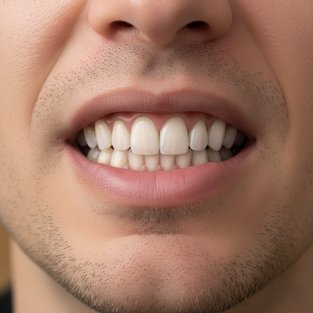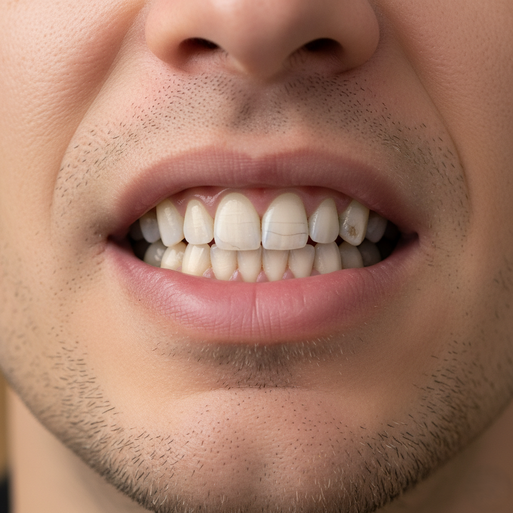 Чоловік 30 років звернувся зі скаргою на розтріскування емалі зубів, що було особливо помітно у фронтальній частині верхнього зубного ряду. Також турбувало патологічне стирання та часткове сколювання верхнього правого ікла, через що його посмішка виглядала «щербатою». Пацієнт почувався невпевнено під час спілкування з іншими людьми та мав комплекси щодо своєї зовнішності.