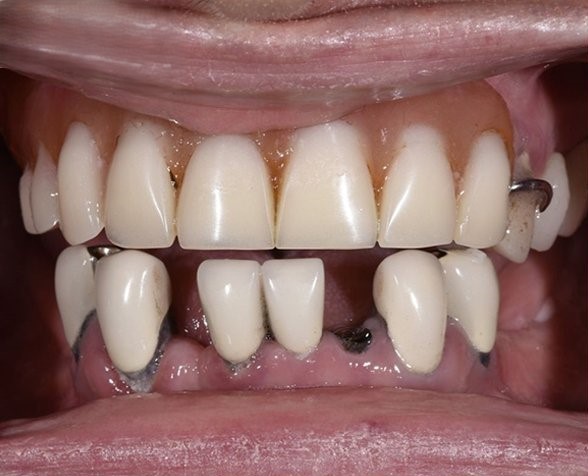 На верхній щелепі часткового відновлення потребували 11 зубів. Відповідно, ми провели необхідне лікування, зокрема деякі одиниці вимагали ендодонтичного, та підготували їх до встановлення керамічних коронок. З кожного зуба зняли відбитки та відправили до зуботехнічної лабораторії. Для захисту поставили тимчасові пластикові коронки, які також забезпечили доволі високий рівень естетики. Одночасно оглянули імпланти нижньої щелепи для контролю первинної остеоінтеграції.
